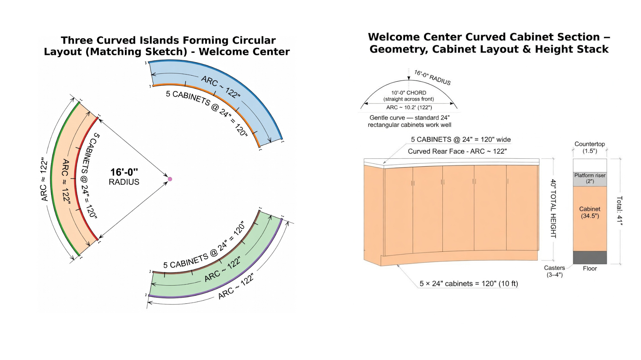 16′ radius • 5 cabinets per section • Mobile • Formica square-edge tops